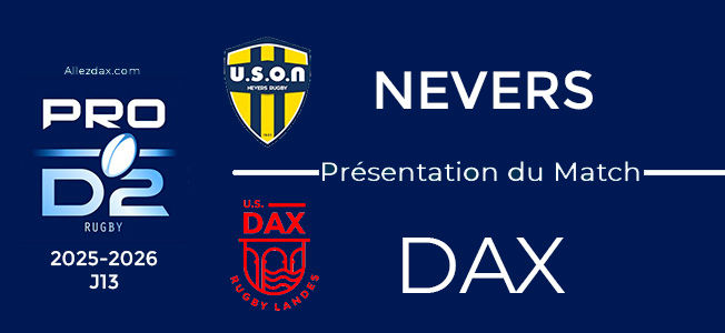 Vendredi 5 décembre 2025, dès 19h30, Nevers reçoit Dax pour le compte de la 13ième journée de championnat de ProD2. Si les Niversois ont cumulé 6 défaites en autant de déplacement, ils ont enchaîné 6 victoires sur leur stade du Pré Fleuri ! Nos Dacquois mesurent donc la difficulté d’y vaincre, mais, n’ont-ils pas déjà gagné à Biarritz il y a seulement 3 semaines … ou, dans cet antre, la saison dernière (24/31) ? Le match est donc à jouer, avec pour Dax le tremplin d’une série déjà en cours de 3 victoires consécutives !