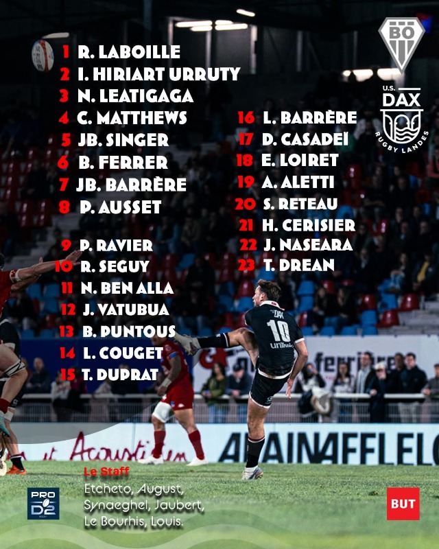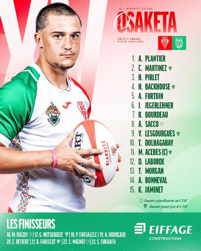 Plusieurs joueurs ont quitté l’infirmerie. Certains sont déjà alignés pour ce match en terres basques : Louis Couget, Romuald Séguy et Théo Duprat. D’autres sont disponibles et postuleront pour le prochain bloc : Alexandre Manukula, Lucas Guillaume et David Lolohea. Un prochain bloc auquel vont aussi prétendre Sam Wasley, Diogo Hasse Ferreira et Jekope Sovau. Théo Gatelier, touché à une main, devra pour sa part patienter. Diego Miranda, concernés par le projet olympique de 2028, est actuellement avec l’équipe de France à VII.