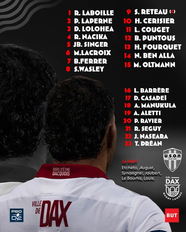 Après la débauche d'énergie lors du derby je pense qu'il va falloir injecter du sang neuf pour ce match à NEVERS avec des joueurs qui doivent avoir les crocs comme Paul LAPERNE, J.B SINGER, Brice FERRER, Sylvère RETEAU, Benjamin PUNTOUS, Naïm Ben ALLA, Louis COUGET ... encadrés par ceux qui reviennent comme Sam WASLEY, Ratu NACIKA, David LOLOHEA ... mais peut-on se passer d'un joueur comme J.B BARRERE le capitaine qui est celui qui donne l'exemple, qui motive, qui est le garant des ambitions Dacquoises