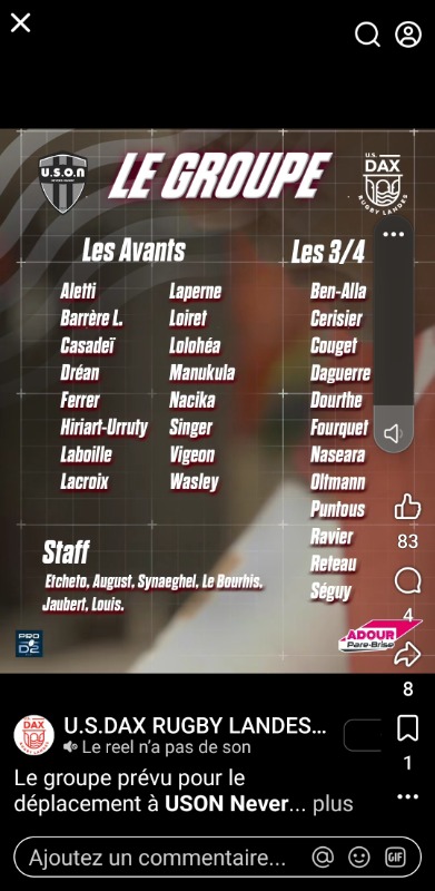 Une réalité , sans J.Baptiste les matchs ne sont plus les mêmes alors qui pour remplir ce rôle de winner ? Qui pour être le leader de cette équipe Dacquoise à Nevers où il faut continuer sur la fabuleuse dynamique qui est actuellement la nôtre car il faut y aller pour glaner des points tant que nous sommes en réussite et ça on peut le faire !