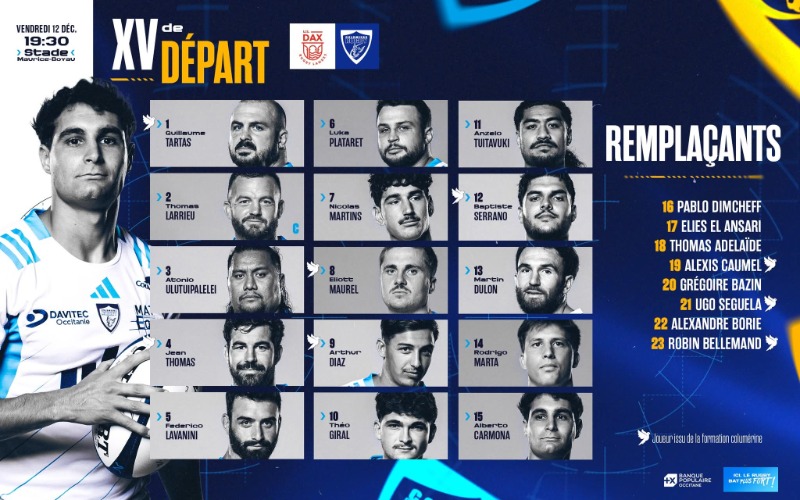 Étrange de se passer de Laboille pour ce match, même si effectivement il a déjà beaucoup joué depuis le début de la saison (pilier le plus utilisé avec Laetigaga). Et s'il est laissé au repos, étrange de se passer de Casadéi qui vient de faire 2 très bonnes rentrées et qui est un pur pilier gauche.